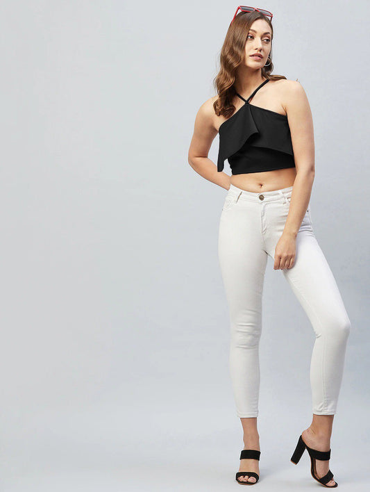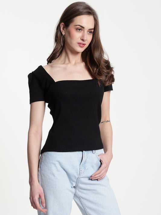 Black Sleeveless Ribbed One Shoulder Crop Top