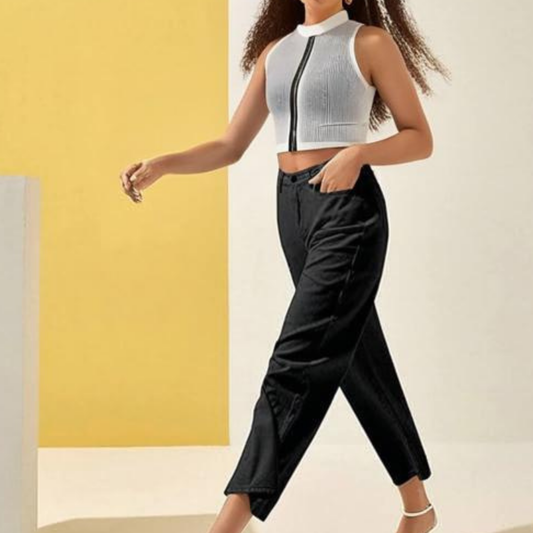 Black Rib Round Neck crop top for women