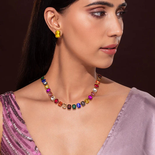 Gold Plated, Multicolour Crystal Necklace Set With Earrings✨